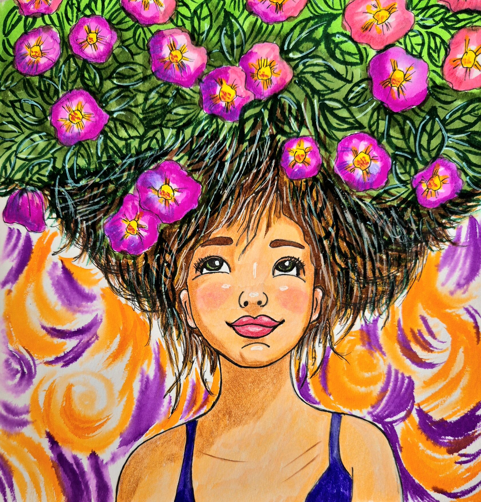 Материалы: лист акварельной бумаги, плотностью от 200 грамм (скетчбук «Collart», формат 19х19 см.). Простой карандаш и стерка. Салфетки. Стакан с водой. Кисть «Белка» Либо синтетика, номер 10. Акварельные маркеры, набор из 24 цветов «Collart». Цветные карандаши «Staedtler». Линер - 0.4 мм., акриловая, белая ручка -10,0 мм.