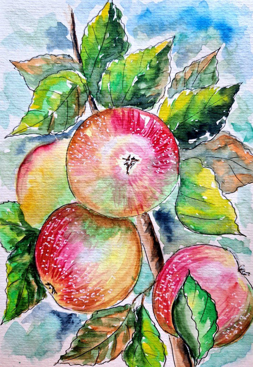 «Яблоки на ветке». Акварельный, ботанический скетчинг для взрослых и детей старшего, школьного возраста.